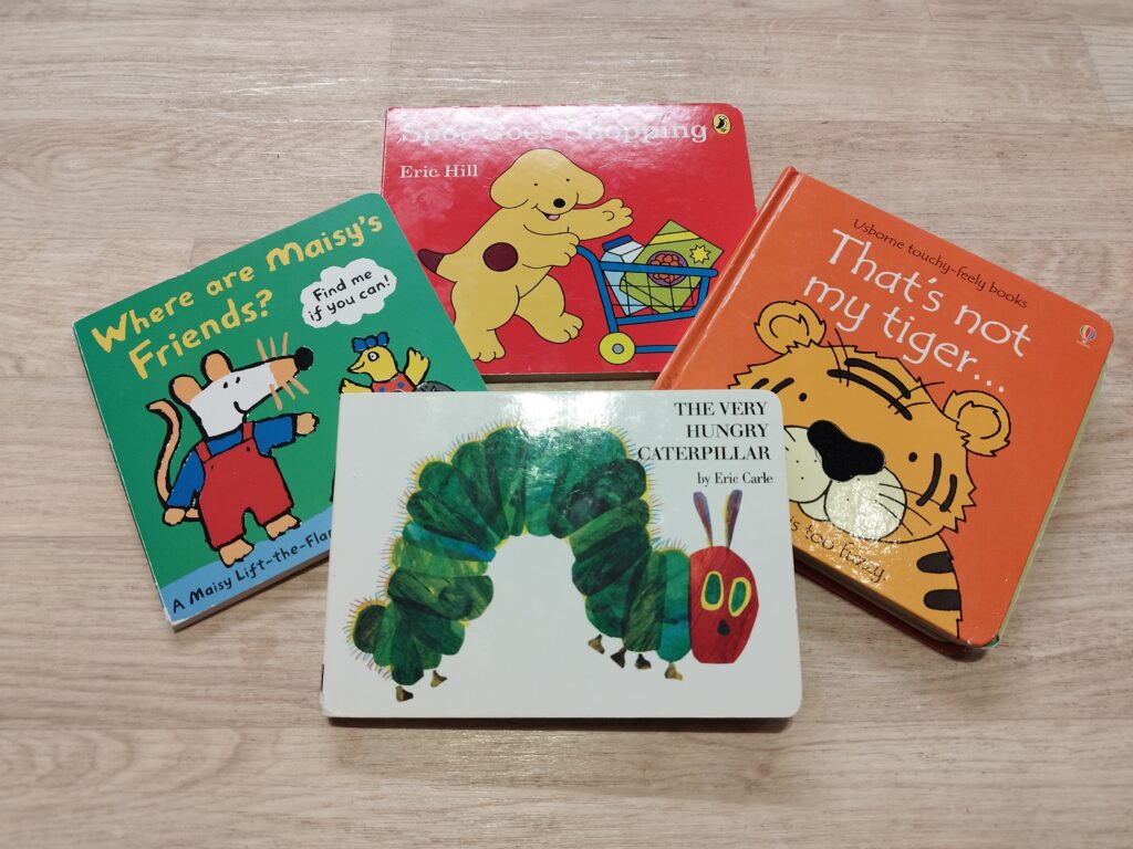 Knížky s obrázky jsou skvělou vizuální oporou, díky které si děti mohou snadno spojovat slovíčka s významy na obrázcích. Já mám oblíbené interaktivní knížky, které mají různá otevírací okénka. Zkuste například tyto knihy: Spot the Dog, Maisy Mouse, série knih That’s Not My… nebo The Very Hungry Caterpillar.